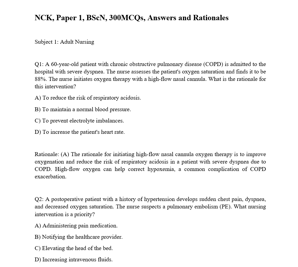 NCK, Paper 1, BScN, 300MCQs, Answers and Rationales